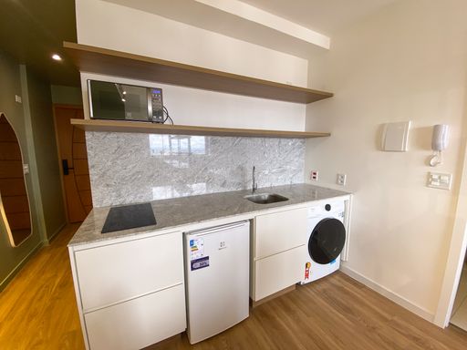 A unidade mobiliada com fogão elétrico, coifa, geladeira, microondas, armários na cozinha, rack, televisão, sofá, cama, bancada, mesa, cadeiras e roupeiro.