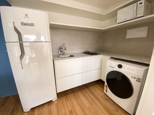 A unidade mobiliada com fogão, geladeira, microondas, armários na cozinha, rack, televisão, sofá, mesa, cadeiras, cama ar condicionado e guarda-roupa.